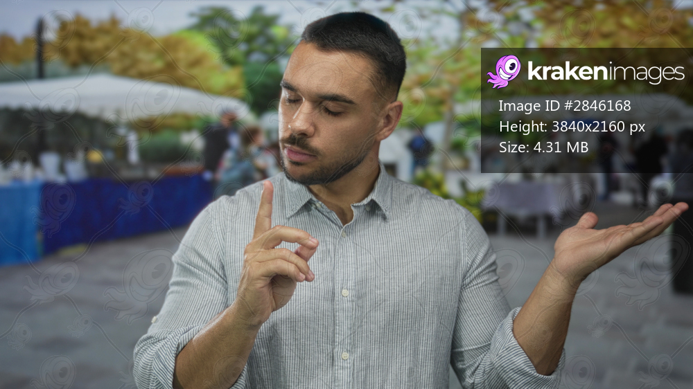 Man extends open palm and shakes his finger while glancing at his raised hand in street market; denial refusal rejection negation.