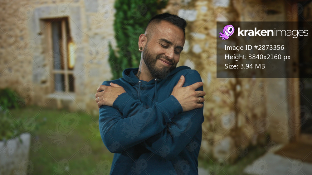 Man with eyes closed arms crossed hugging chest at building entrance of stone house outdoors wearing blue hoodie and rings; self care contentment.