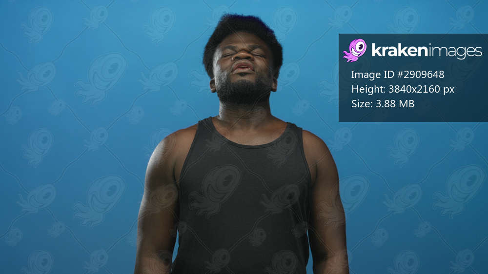 Man with eyes closed and head tilted up in a studio, wearing a black tank top with bare shoulders and relaxed posture; deep breath relief.
