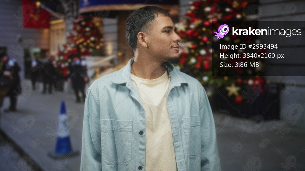 Man face looking right by decorated christmas tree on city street, wearing light denim jacket and beige t shirt; contemplation.