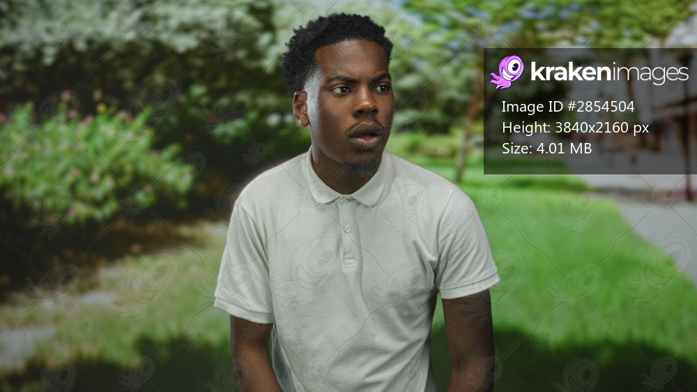 Man face looks surprised wearing white polo shirt amid green foliage on urban street; surprise curiosity.