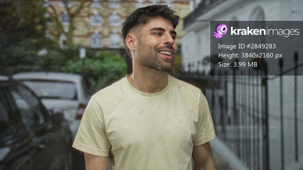 Man face smiling wearing white t shirt on street beside parked cars and iron fence; confidence joy.