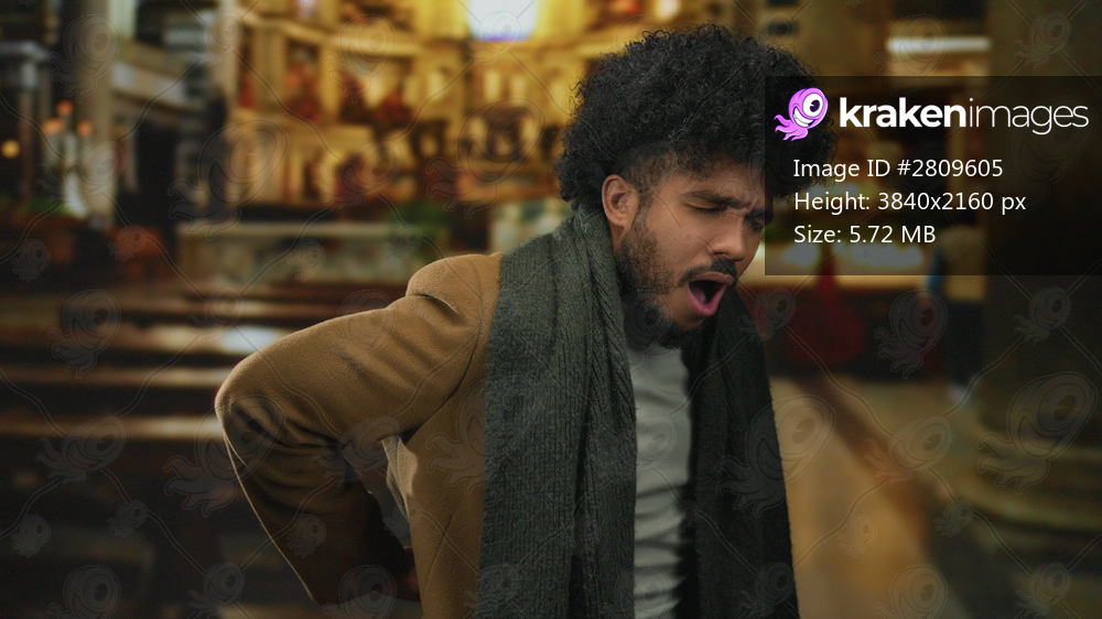 Man feeling back pain in a church interior, wearing scarf and coat, expression of discomfort indoors, showcasing male emotion and atmosphere of spirituality. - Kraken Images