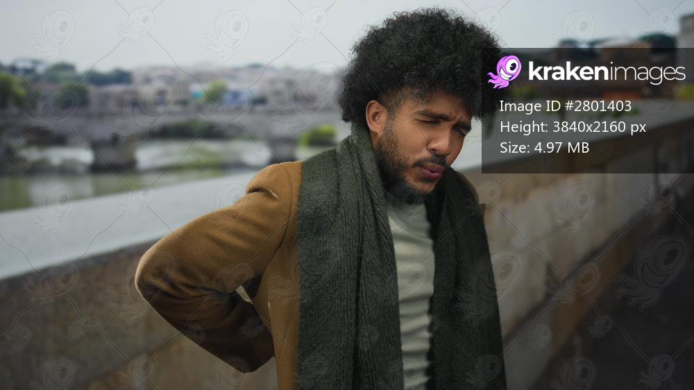 Man feeling back pain outdoors by a river with a bridge as the background, showcasing discomfort and autumn attire on a cloudy day, emphasizing nature and city vibes. - Kraken Images