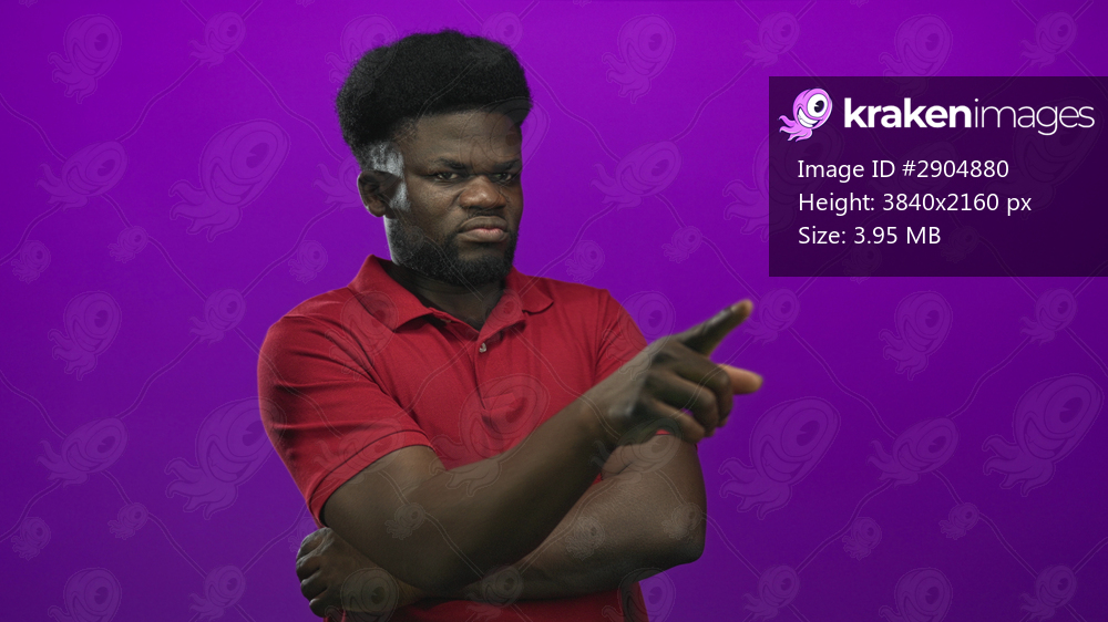 Man with finger pointing and folded arms in studio purple wall wearing red polo shirt, frowning at camera; doubt.