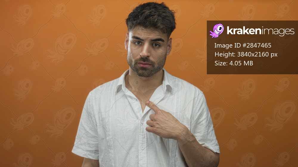 Man with finger pointing to chest under orange studio lighting with neutral facial expression; doubt.