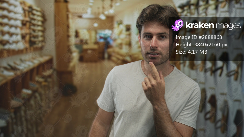 Man with finger to chin examining wall of sandals and shoes in a narrow shoe store aisle; quiet contemplation.