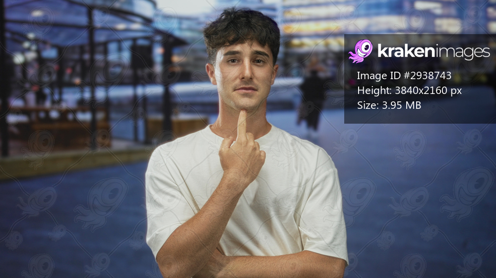 Man with finger to chin and hand on jaw on city street in front of glass building, wearing white t shirt; thoughtful.