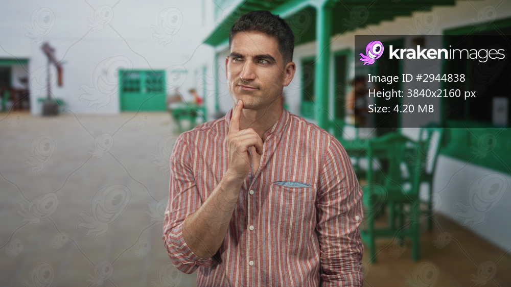 Man with finger to chin pensive gesture in front of green building patio chairs and doorway; thoughtful curiosity.