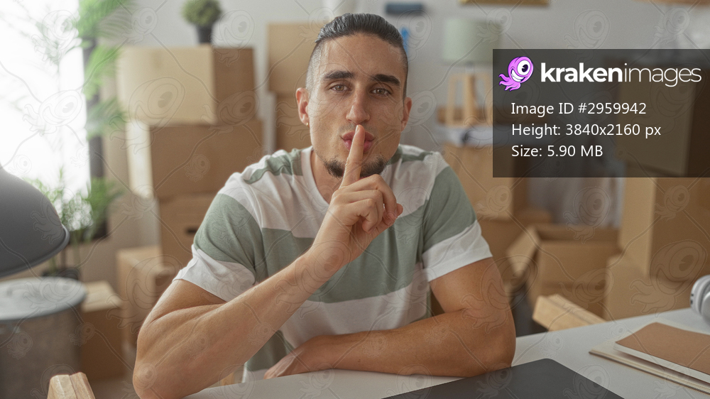 Man with finger to lips for silence amid packed moving boxes and notebook on table in home; quiet secrecy.
