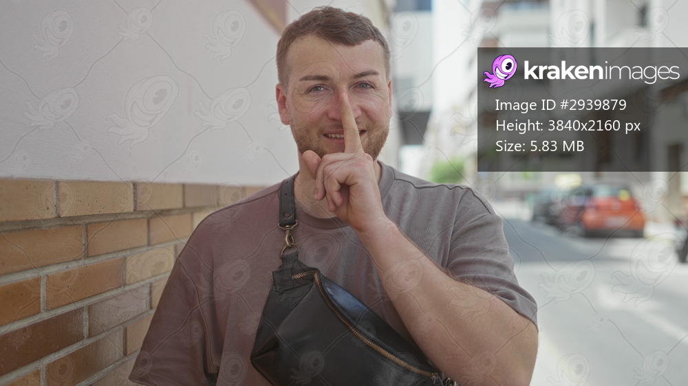 Man finger to lips for silence with crossbody bag on street beside a brick wall and parked cars; quiet secrecy.
