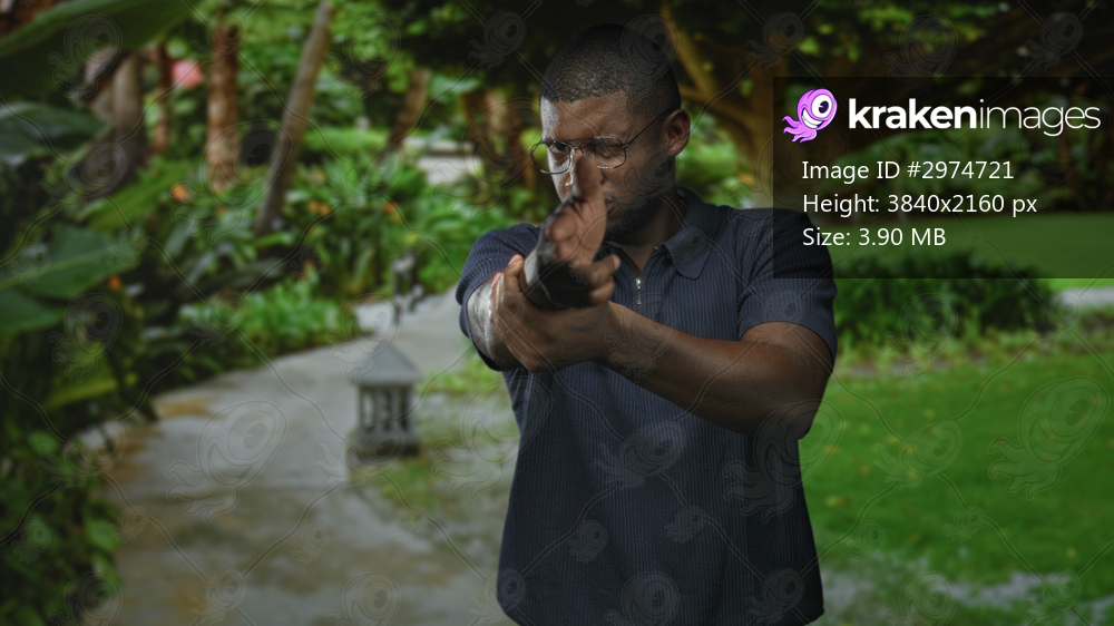 Man finger to lips for silence holding his wrist, wearing glasses and navy shirt in forest pathway; contemplation.
