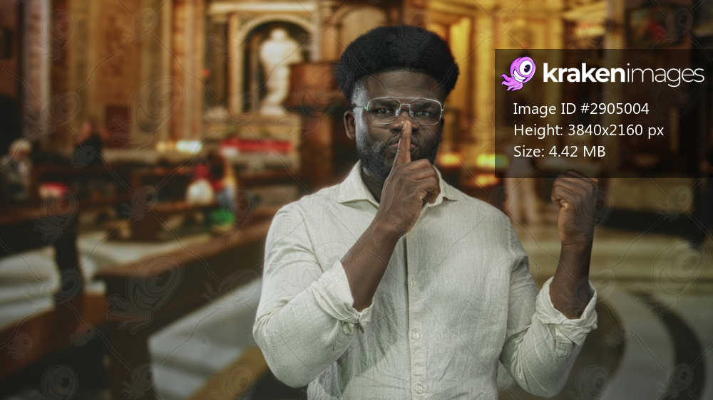 Man with finger to lips for silence in church building, smiling and wearing glasses and white shirt while raising a fist in quiet gesture; reverence silence. - Kraken Images