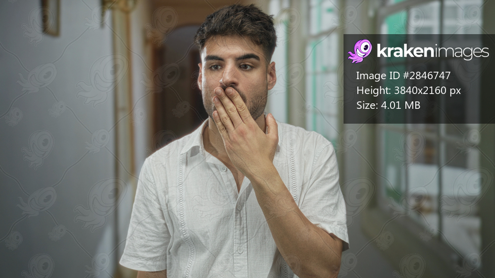 Man finger to lips for silence in hotel building corridor under soft daylight shining through window; secrecy.