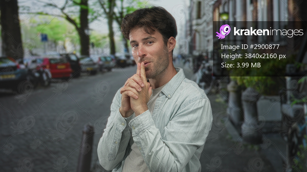 Man with finger to lips for silence on a city street near parked cars and bicycles; secret mischief.