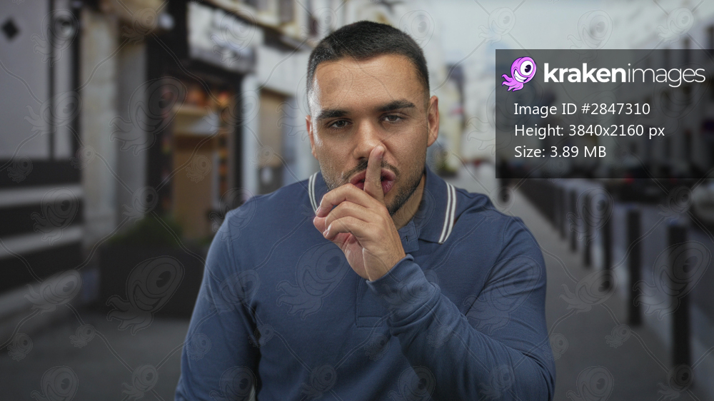 Man finger to lips for silence on busy urban street lined with storefronts and parked cars in daylight; quiet secrecy.