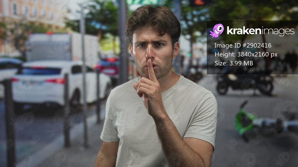 Man finger to lips for silence on street with parked cars and green scooter nearby, crowded sidewalk and motorcycles behind him; quiet caution.