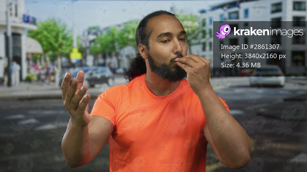 Man with finger to lips for silence and open hands on a city street near buildings wearing orange shirt; contemplation quiet appeal.