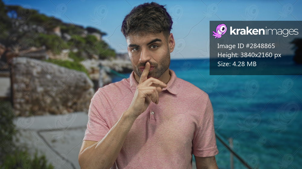 Man with finger to lips for silence wearing a pink polo shirt by gentle waves on a sunny beach; serenity.