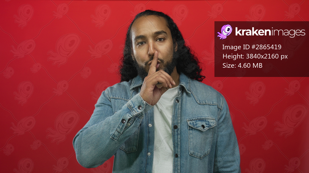 Man with finger to lips for silence, wearing denim jacket and white t shirt with beard visible in red studio; secret hush calm.