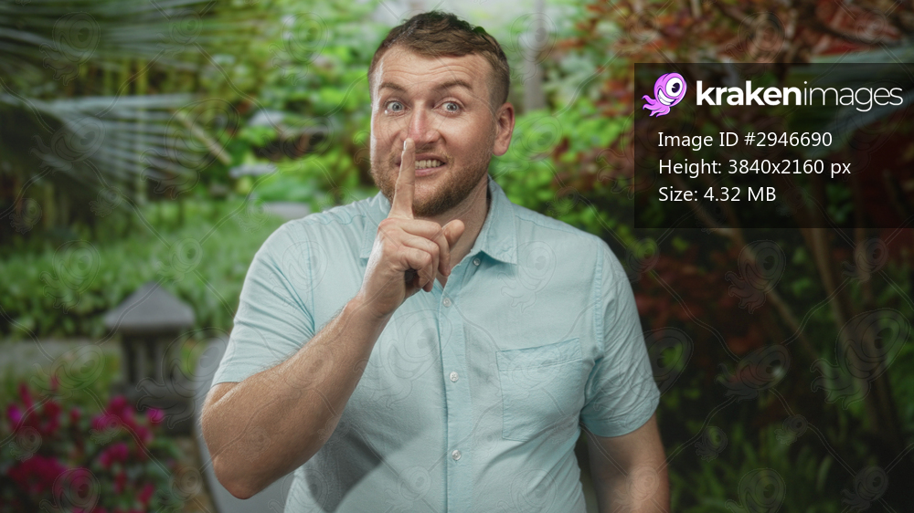 Man finger to lips in park with green foliage and stone lantern, smiling in light blue shirt and beard visible; playful secret.