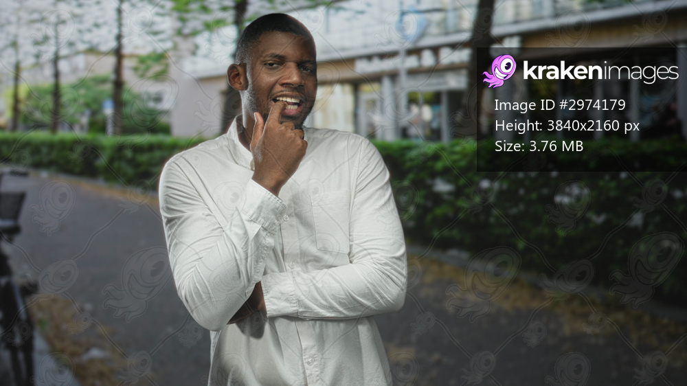 Man with finger to mouth and arms crossed touching his teeth on an urban street by a storefront hedge; thoughtful reflection.