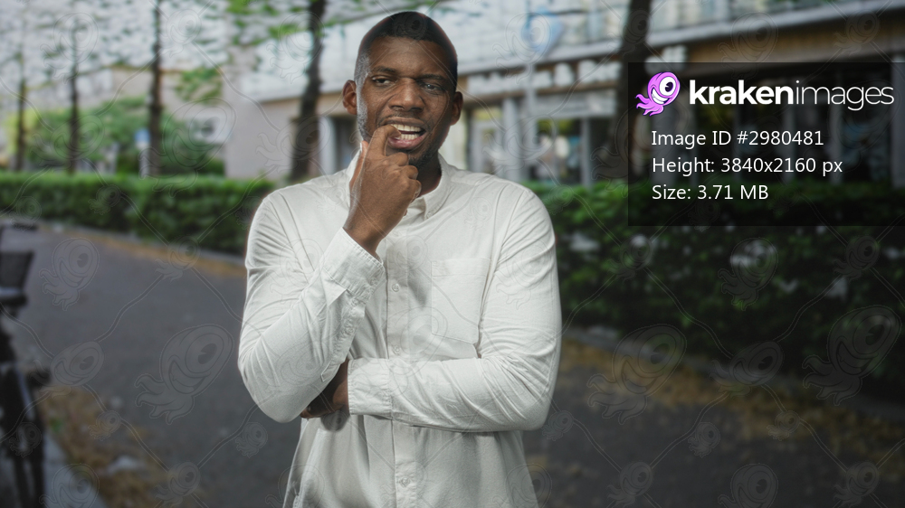 Man with finger to mouth and arms crossed touching his teeth on an urban street by a storefront hedge; thoughtful reflection.