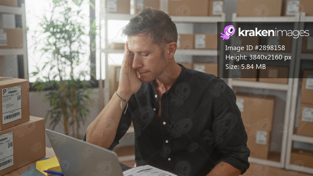 Man with finger to temple holding document and parcel by shelving in building; concentration planning efficiency.