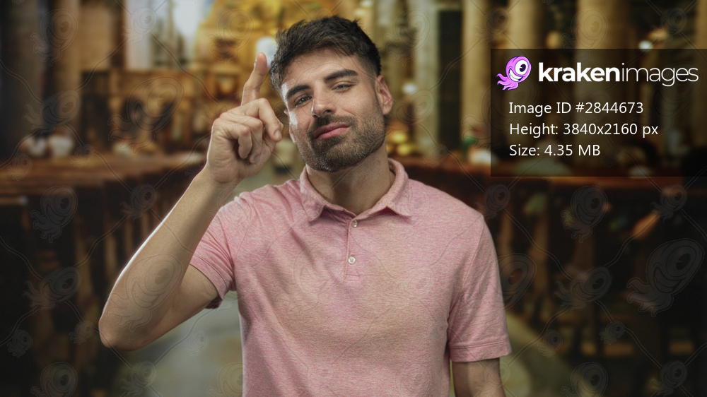 Man finger to temple in historic stone church interior with wooden pews and marble columns; serenity reflection.