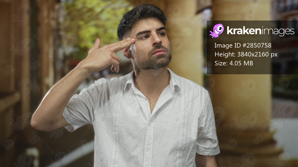 Man with finger to temple on sunlit street between historic columns in city, wearing white shirt and neutral expression; stress.