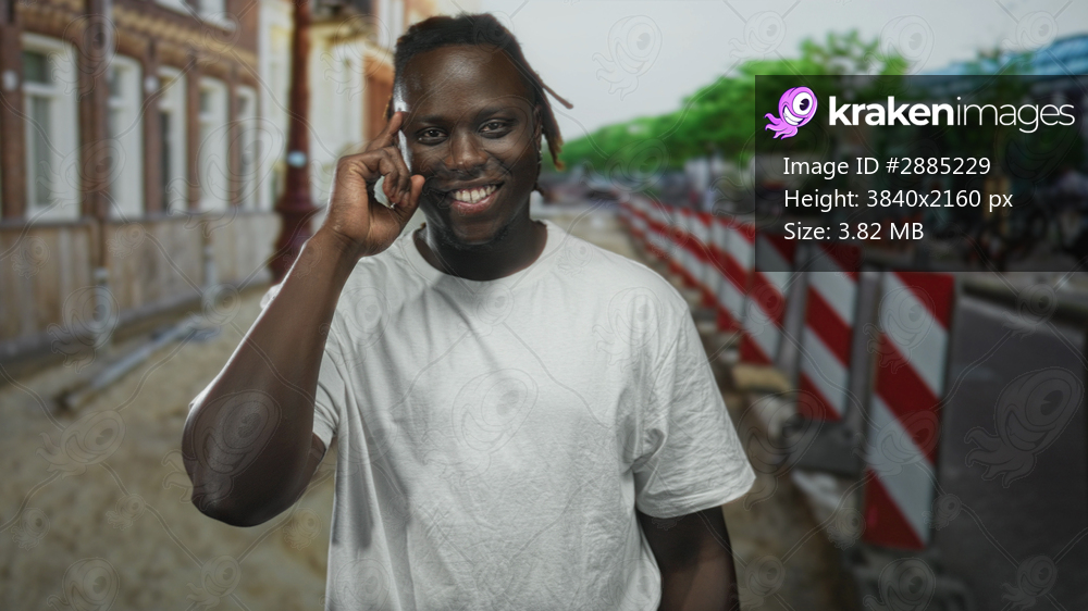 Man with finger to temple pointing head on street wearing white t shirt and smiling broadly; thoughtful reflection.