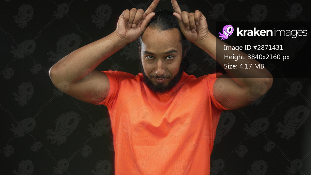 Man with fingers forming horns and bare forearms in studio with black backdrop wearing orange shirt; playful mischief.