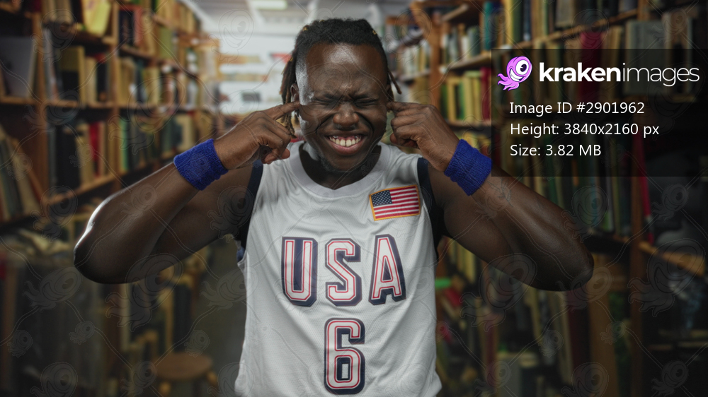 Man with fingers in ears grimacing in library wearing usa jersey and wristbands; study distraction frustration.