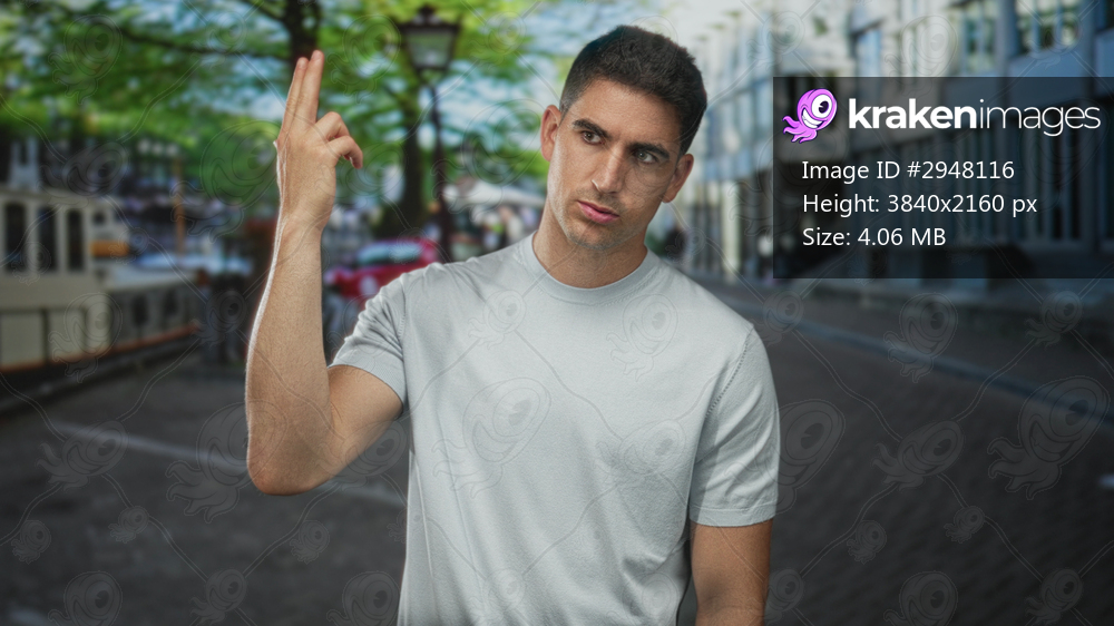 Man with fingers to temple on a city street wearing white tshirt and tense expression while making a gunlike hand gesture; inner frustration.