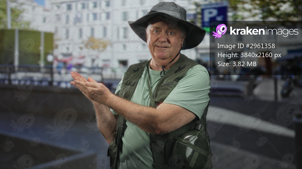 Man fisherman clapping hands and pointing index finger, wearing bucket hat and fishing vest on a street near parked bikes and a parking sign; curiosity adventure. - Kraken Images