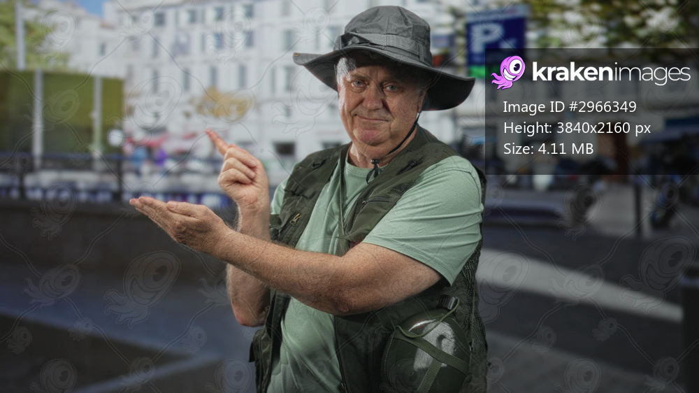 Man fisherman clapping hands and pointing index finger, wearing bucket hat and fishing vest on a street near parked bikes and a parking sign; curiosity adventure. - Kraken Images