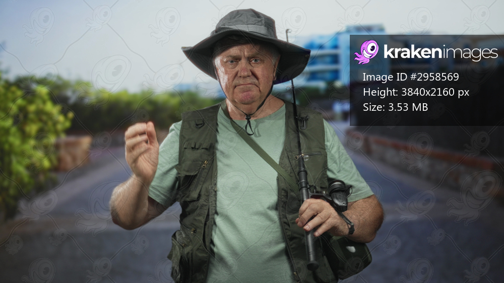 Man fisherman holding a fishing rod and binoculars, hand to ear and wearing sun hat and vest on a street near waterfront buildings; reflection solitude. - Kraken Images