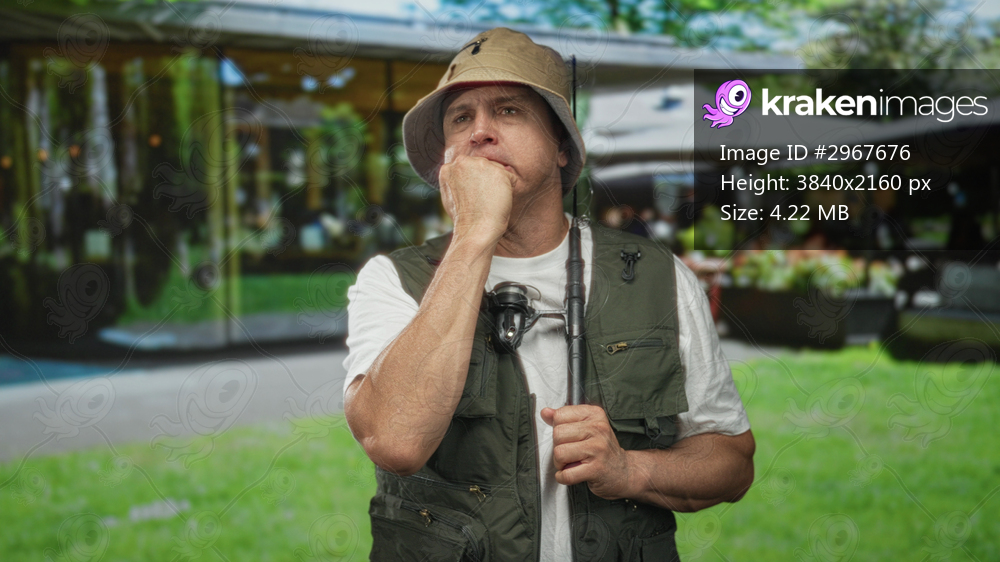 Man fisherman holding fishing rod, fingers to mouth and hand on pole, bucket hat and vest visible in building; quiet contemplation.