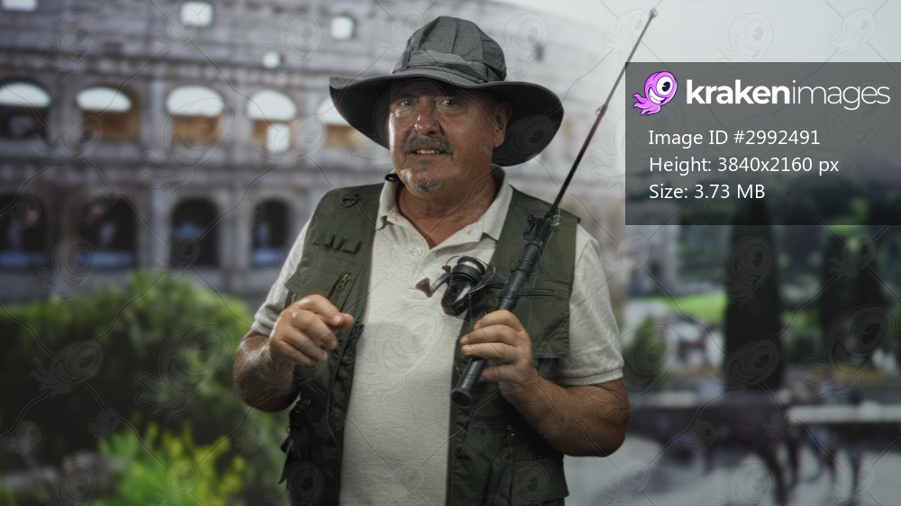 Man fisherman holding fishing rod and reel, wearing hat and vest, visible hands on pole in front of colosseum set in a studio; travel nostalgia.