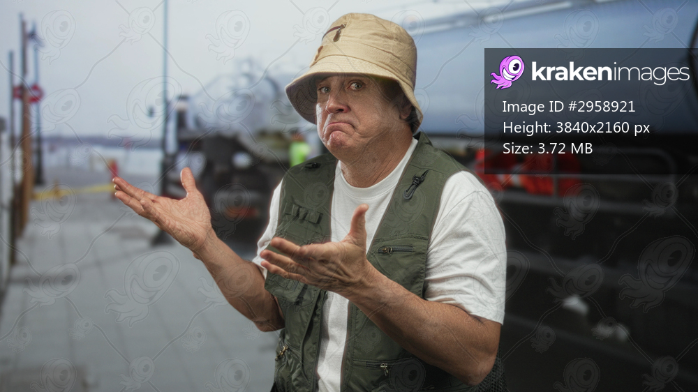 Man fisherman in bucket hat and fishing vest pointing finger at a fuel tanker on street while shrugging hands and squinting; confusion waiting reflection. - Kraken Images