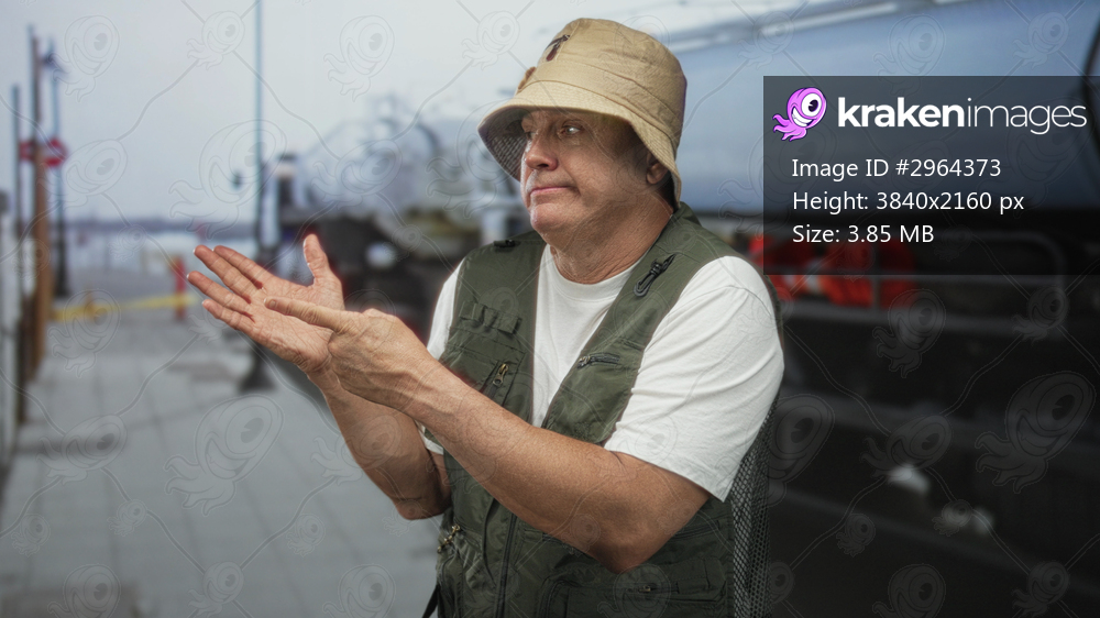 Man fisherman in bucket hat and fishing vest pointing finger at a fuel tanker on street while shrugging hands and squinting; confusion waiting reflection. - Kraken Images