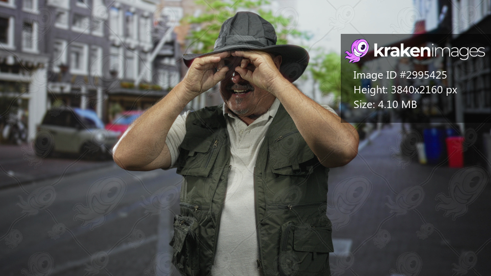 Man fisherman in fishing vest and hat cups hands to eyes in a binocular pose to peer down a narrow urban street lined with buildings and parked car; curiosity exploration. - Kraken Images