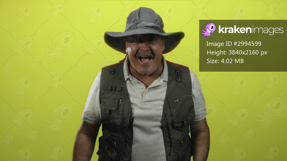 Man fisherman in hat and fishing vest raises hands toward face and opens mouth in studio; surprise adventure.