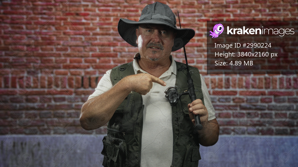 Man fisherman in hat wearing a fishing vest holds a rod and gives thumbs up toward camera in studio; confidence experience leisure.