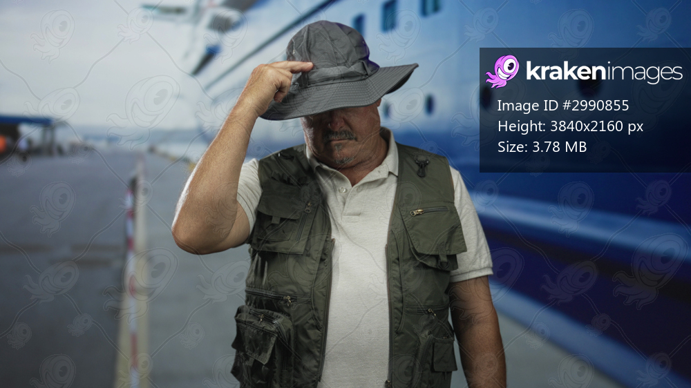 Man fisherman in olive vest tips wide brim hat over eyes at dock pier beside a moored cruise ship, hand on brim gesture; quiet solitude.
