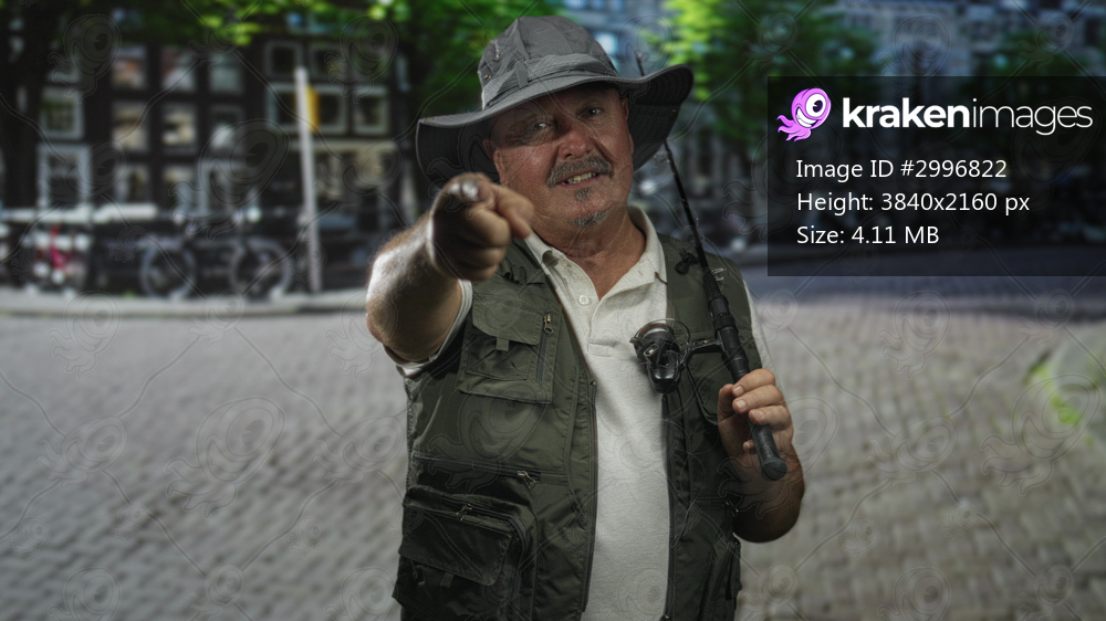 Man fisherman points finger while holding a fishing rod and wearing hat and vest on a cobbled street with bicycles and buildings; adventure confidence. - Kraken Images