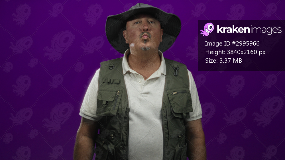 Man fisherman points index fingers while wearing hat and fishing vest in studio purple backdrop; playful confidence.