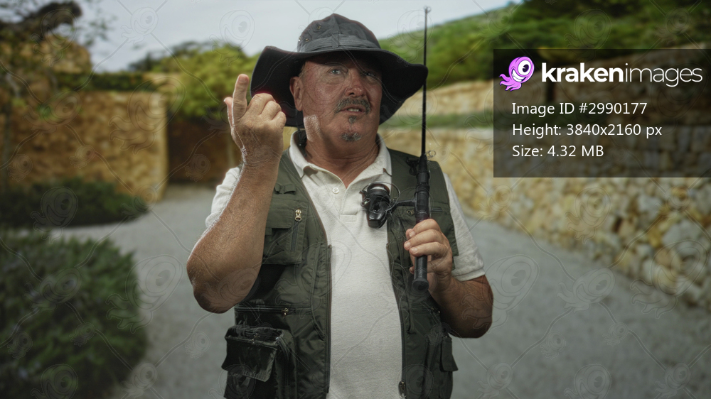 Man fisherman senior hispanic wearing hat and vest holding fishing rod touches ear while looking upward on stone street; serenity patience solitude.