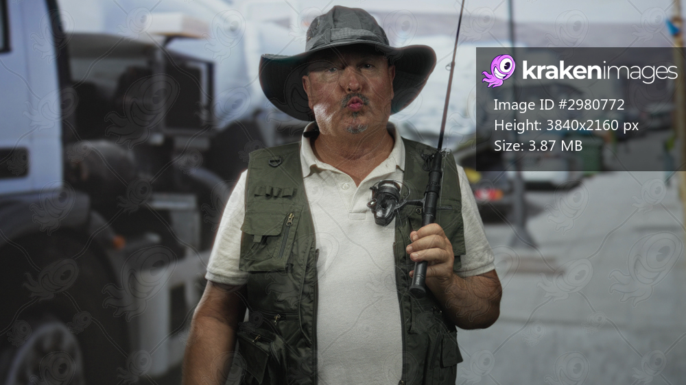 Man fisherman senior holding fishing rod and tipping wide brim hat on street wearing fishing vest with visible reel near parked truck and sidewalk; contentment. - Kraken Images