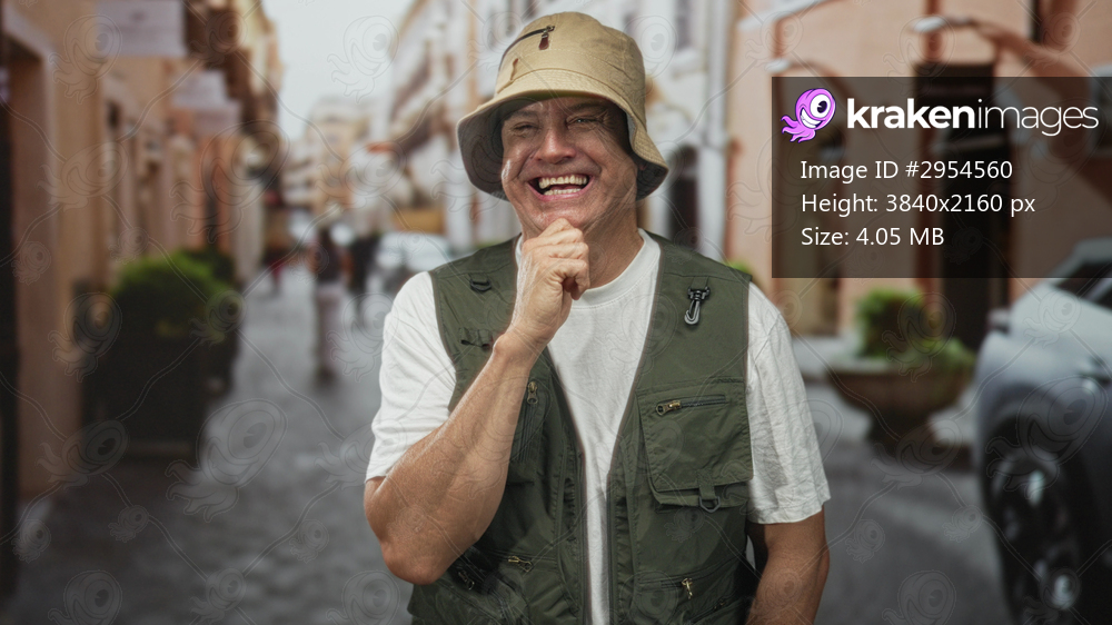 Man fisherman wearing bucket hat and fishing vest, finger to lips shushing on a cobblestone street; playfulness secrecy.